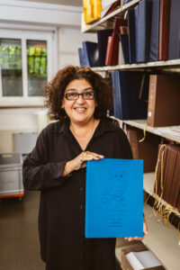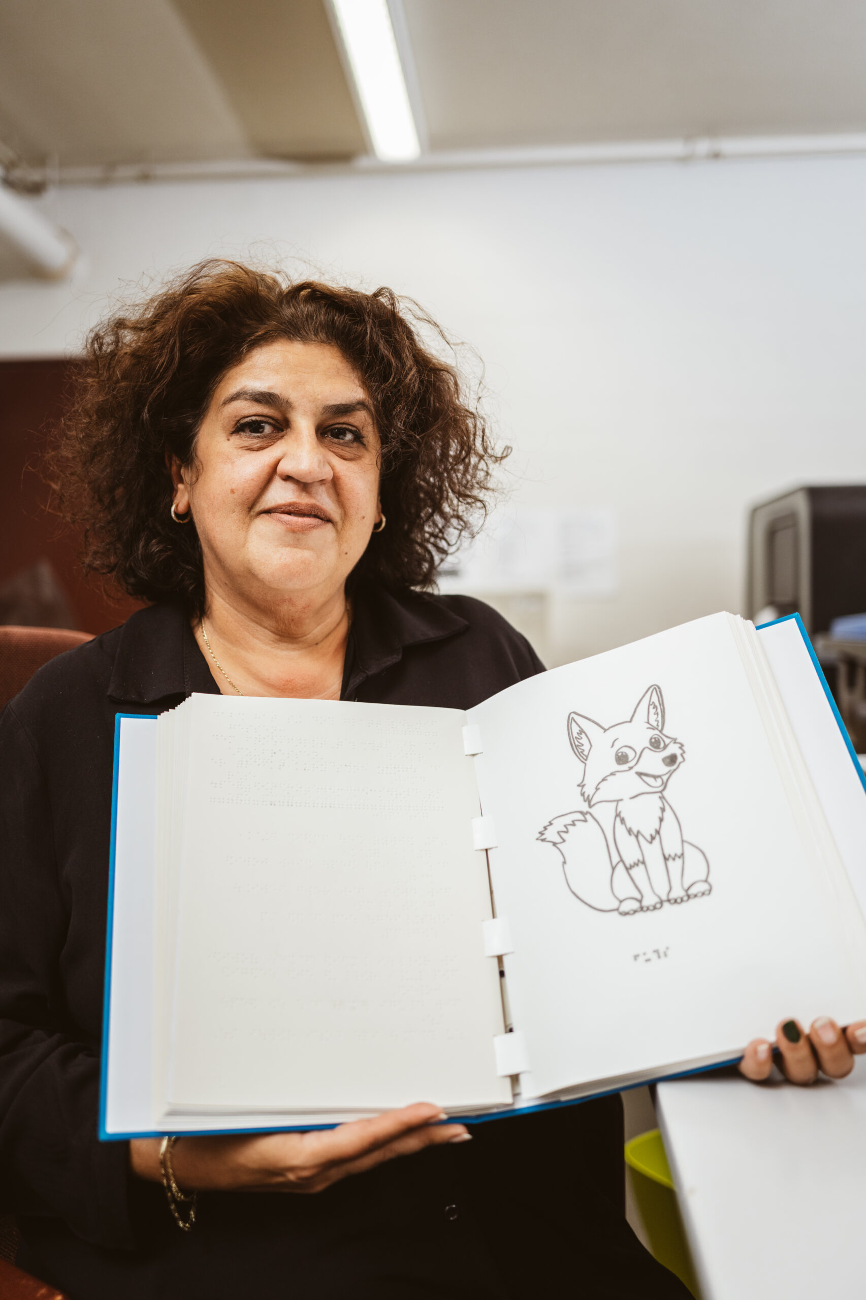 Auf dem Bild sehen Sie unsere Betriebsleitung Eva Naggert mit dem Buch „Huhu sprach der Uhu“ von Ursula Gruß Auf dem Bild sehen Sie unsere Betriebsleitung Eva Naggert mit einem Tastbild (Fuchs) aus dem Buch „Huhu sprach der Uhu“ von Ursula Gruß